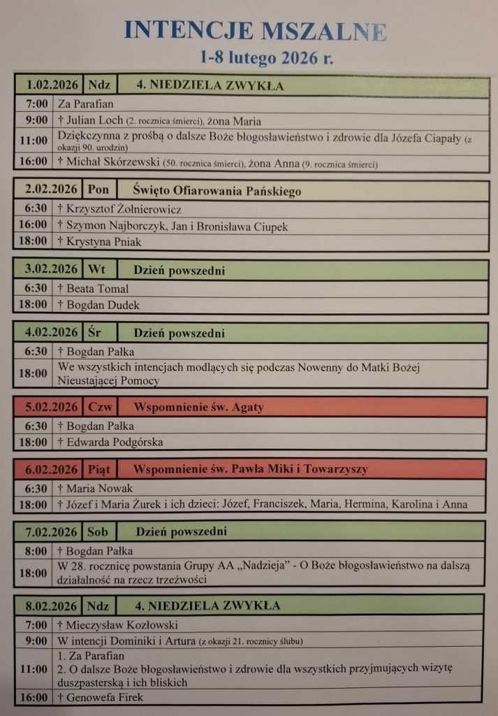 INTENCJE MSZALNE 25 stycznia – 1 lutego 2026 r. 25.01.2026 Ndz 3. NIEDZIELA ZWYKŁA 7:00 † Genowefa Firek 9:00 † Anna Pawletta 11:00 Za Parafian 16:00 † Bolesław Lech (1. …