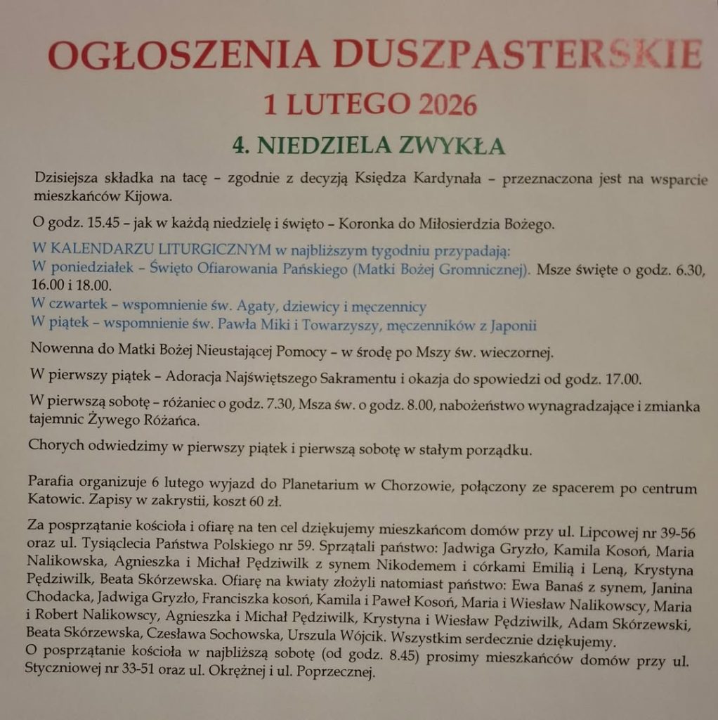 OGŁOSZENIA DUSZPASTERSKIE 18 STYCZNIA 2026 2. NIEDZIELA ZWYKŁA Razem z Teatrem Pod Dobrym Okiem zapraszamy na wspólne kolędowanie po Mszach świętych o godz. 11.00 i 16.00 w sali teatralnej. Koronkę …